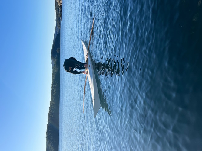 Otto som står i eigen, sjølvbygd grønlandskajakk i sommar